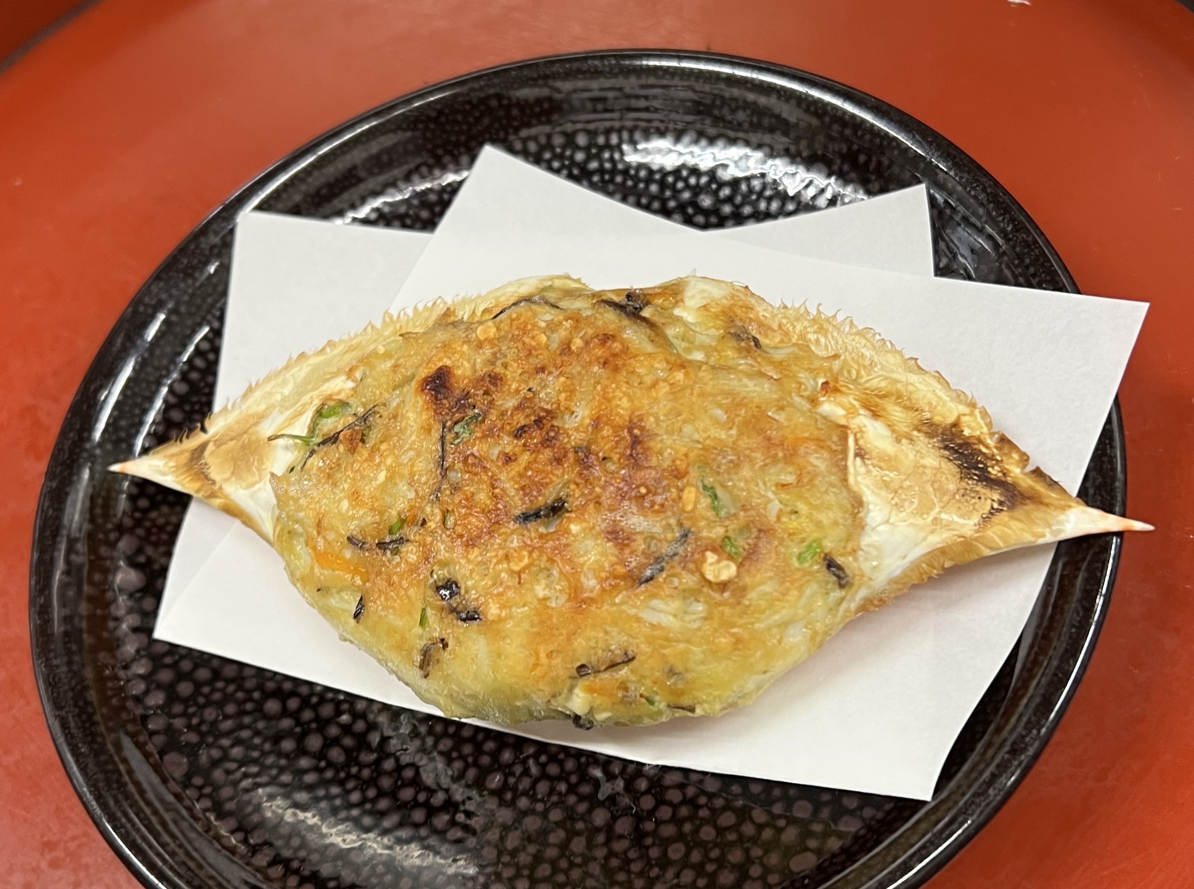 活きた渡り蟹をむしてから、丁寧に身をほぐして、三つ葉、人参、キクラゲを添えて、甲羅に詰めてパルメジャーノを振りかけて、オープンで焼き上げます。