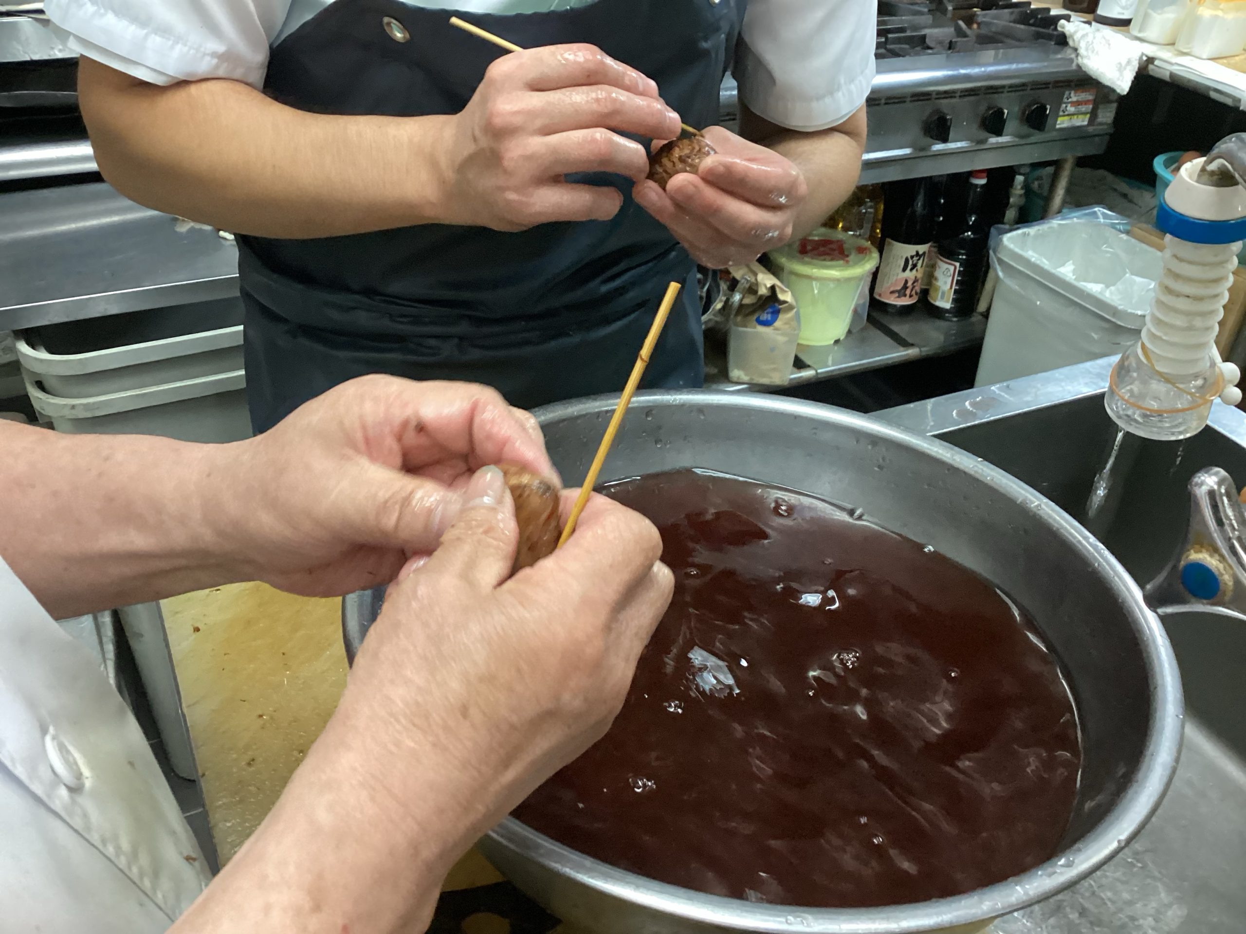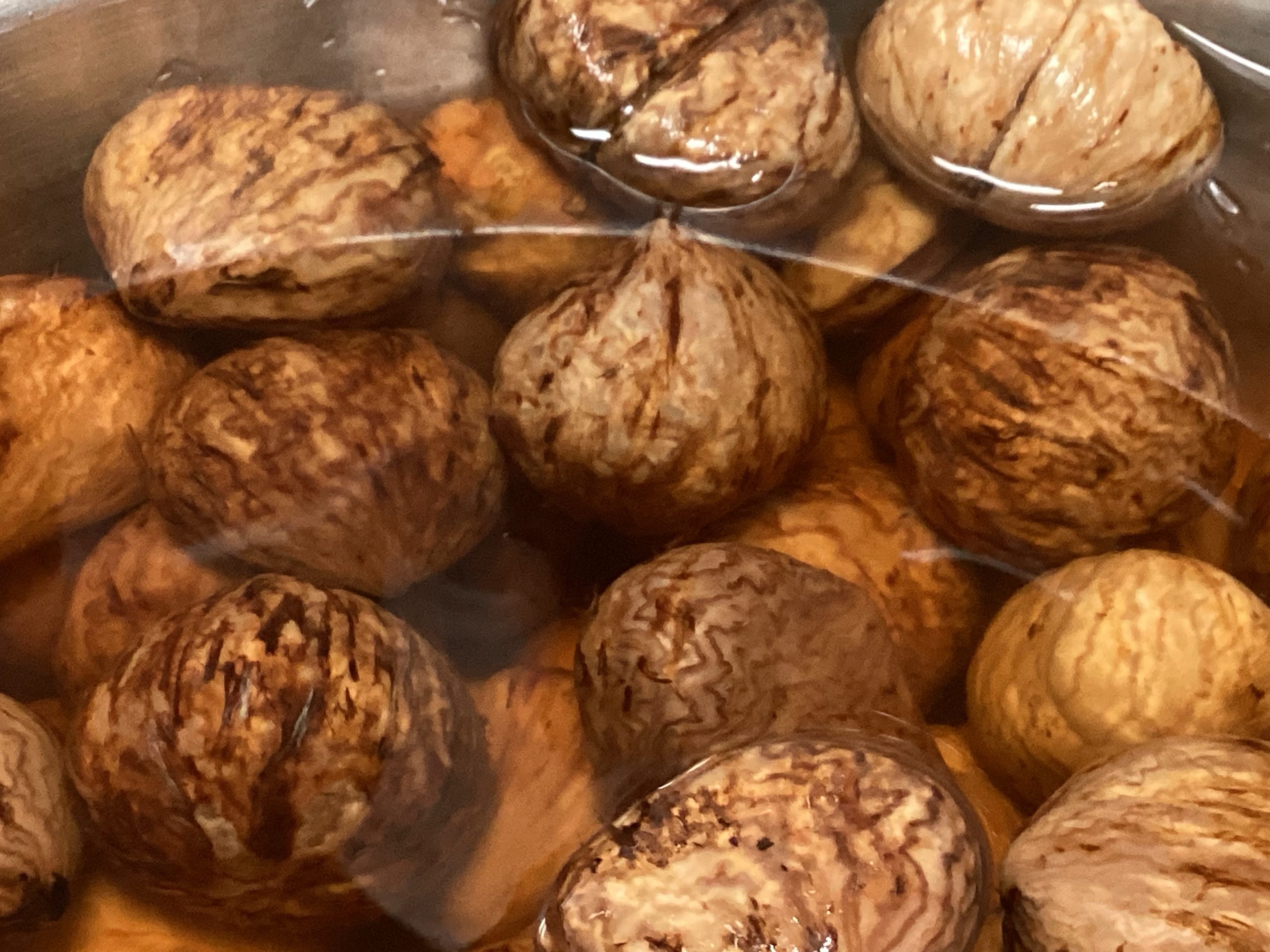 栗を渋皮を残してシロップで含め煮にしました。栗の渋皮煮です。渋皮を破らないようにしなくては綺麗な仕上がりになりません。意外と神経を使う調理です。