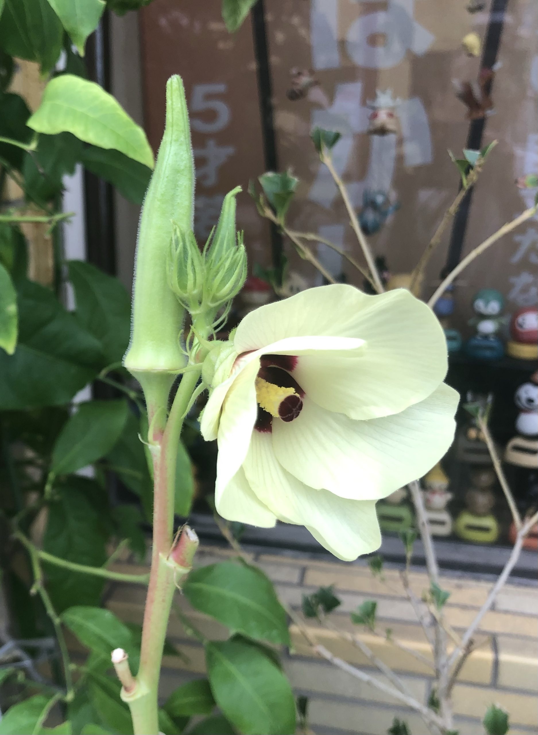 オクラの花を見つけました。近所の散髪屋さんの玄関に置かれている鉢です。綺麗な花ですね。