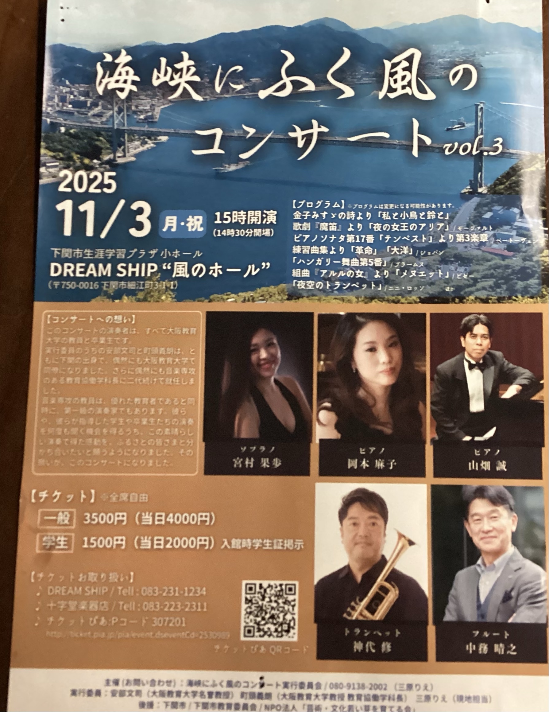 2025.11.02 お知らせ 海峡にふく風のコンサート 明日、11月3日、ドリームシップ「風のホール」にて海峡にふく風のコンサートが開催されます。15時開演です。超ハイレベルなコンサートをお楽しみ下さい。