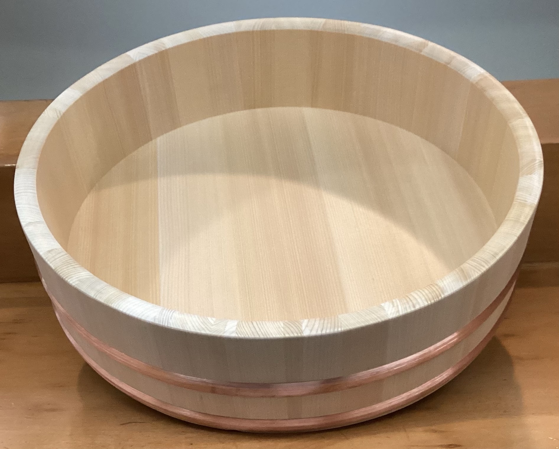 お寿司のシャリを合わせ酢を絡ませる時に使う、木製の桶です。半切りとも呼ばれています。老朽化に伴い、新しい飯台を仕入れました。心を込めてシャリを作ります。
