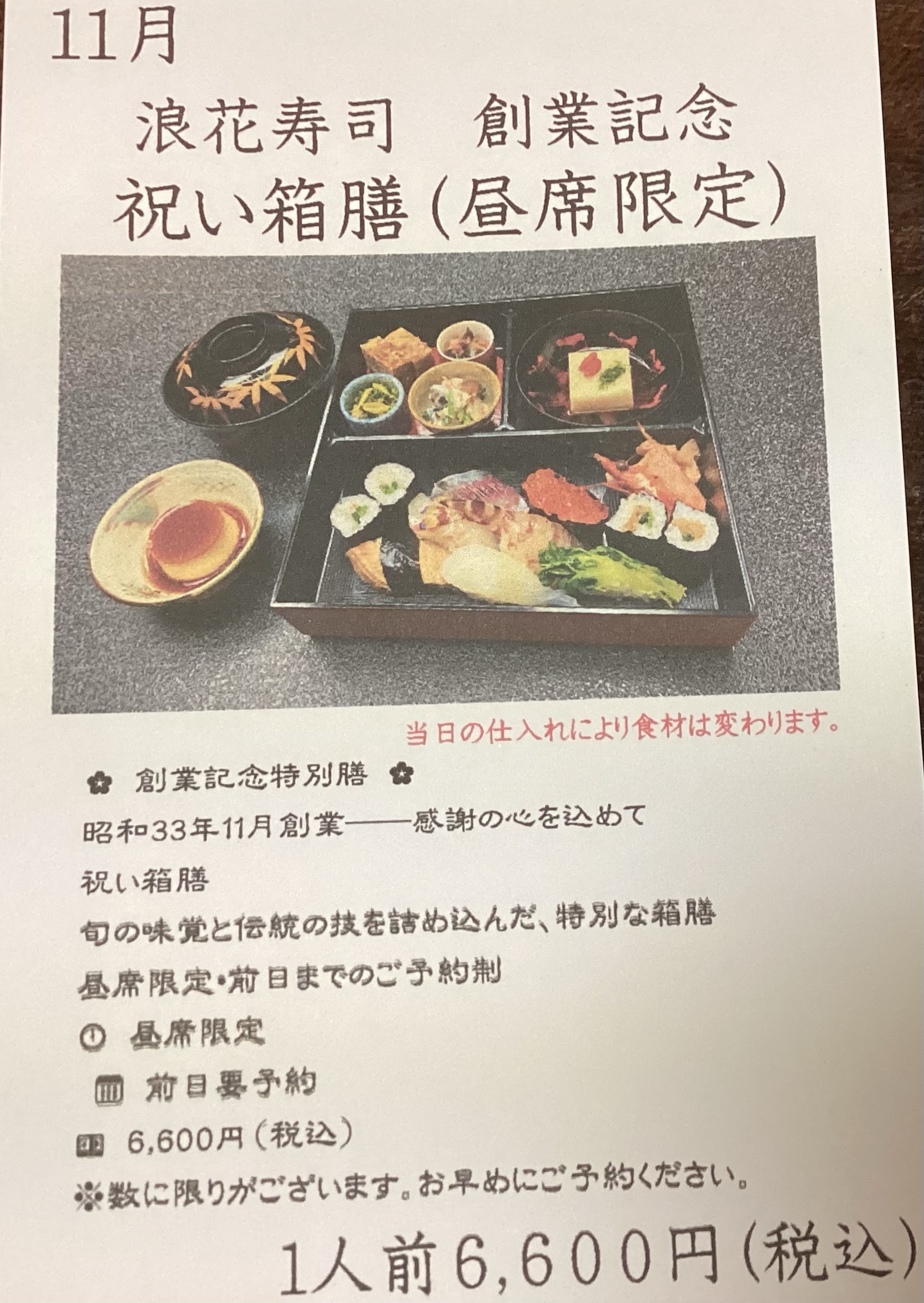 感謝の心を込めて、「祝い箱膳」が好評です。11月の限定メニューです。ご来店をお待ち致しております。