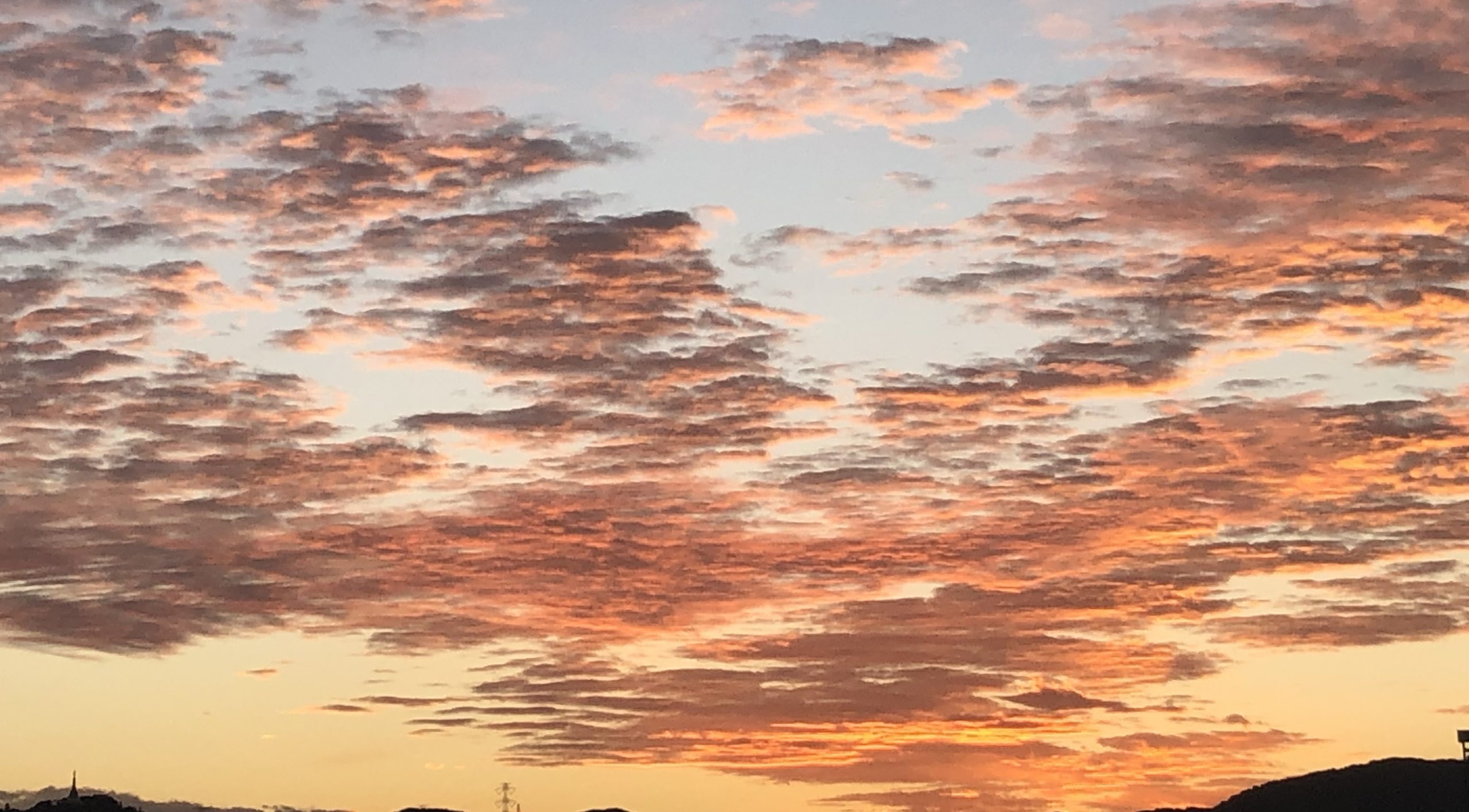 関門海峡上空の朝焼けですね。思わず手を合わせています。