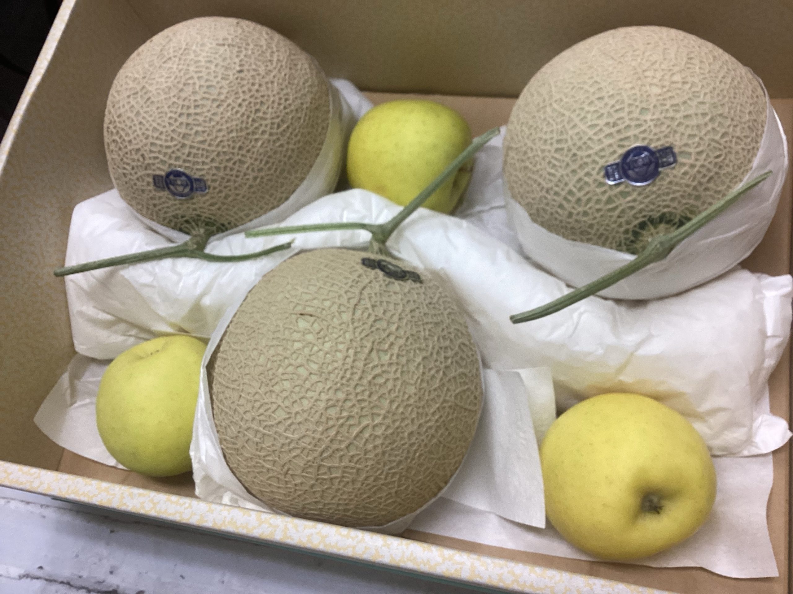 メロンは美味しくなるように追熟しています。同じ箱にリンゴを一緒に入れるとメロンが早く美味くなるようです。あ