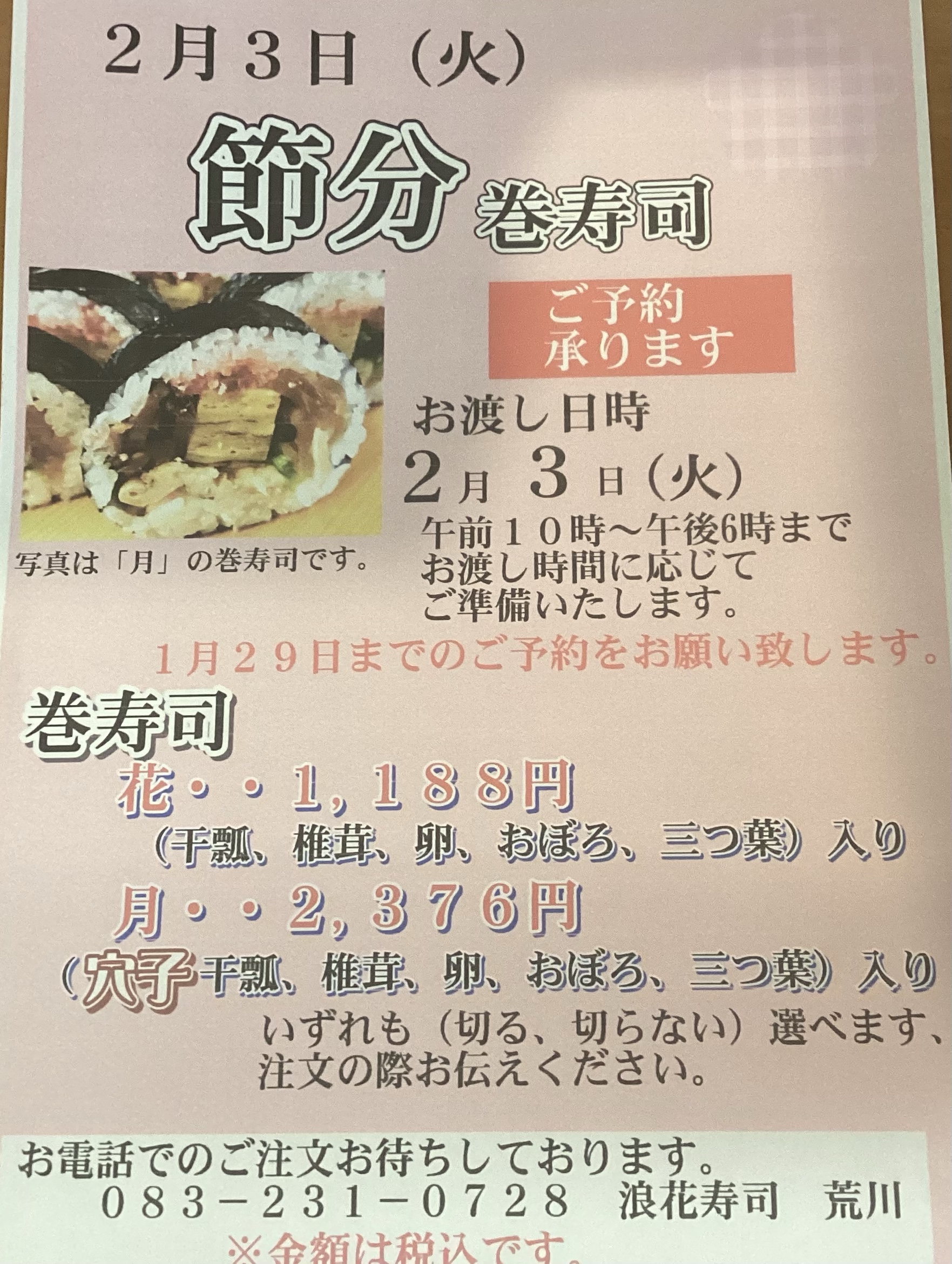 巻き寿司のご予約を受け付けています。お電話でのご予約をお待ち致しております。