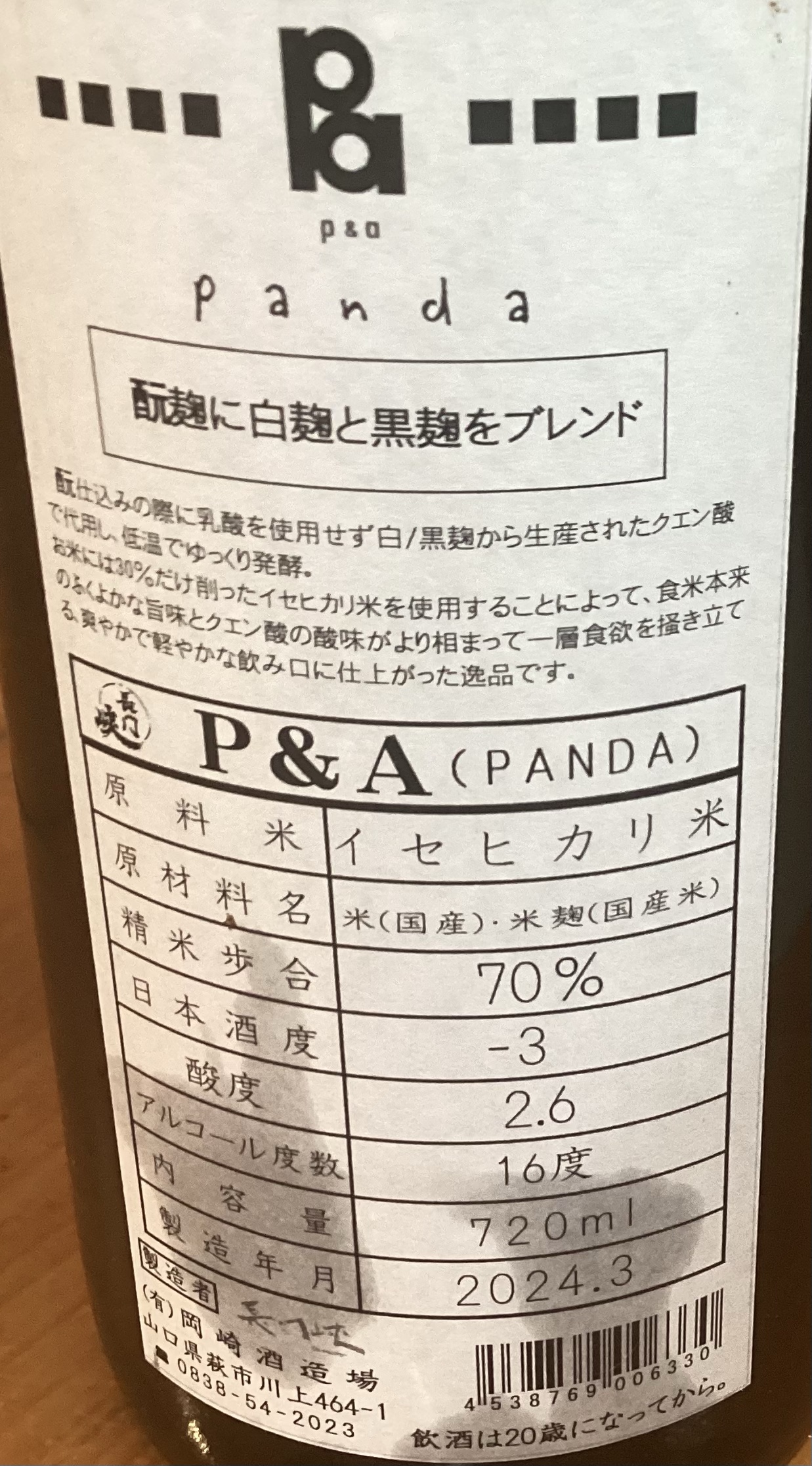 萩市の長門峡の代表銘柄で有名な岡崎酒造場の面白いお酒が入荷しました。酒米はイセヒカリで酛麹に白麹と黒麹を使っている事から、パンダのネーミングになったようです。