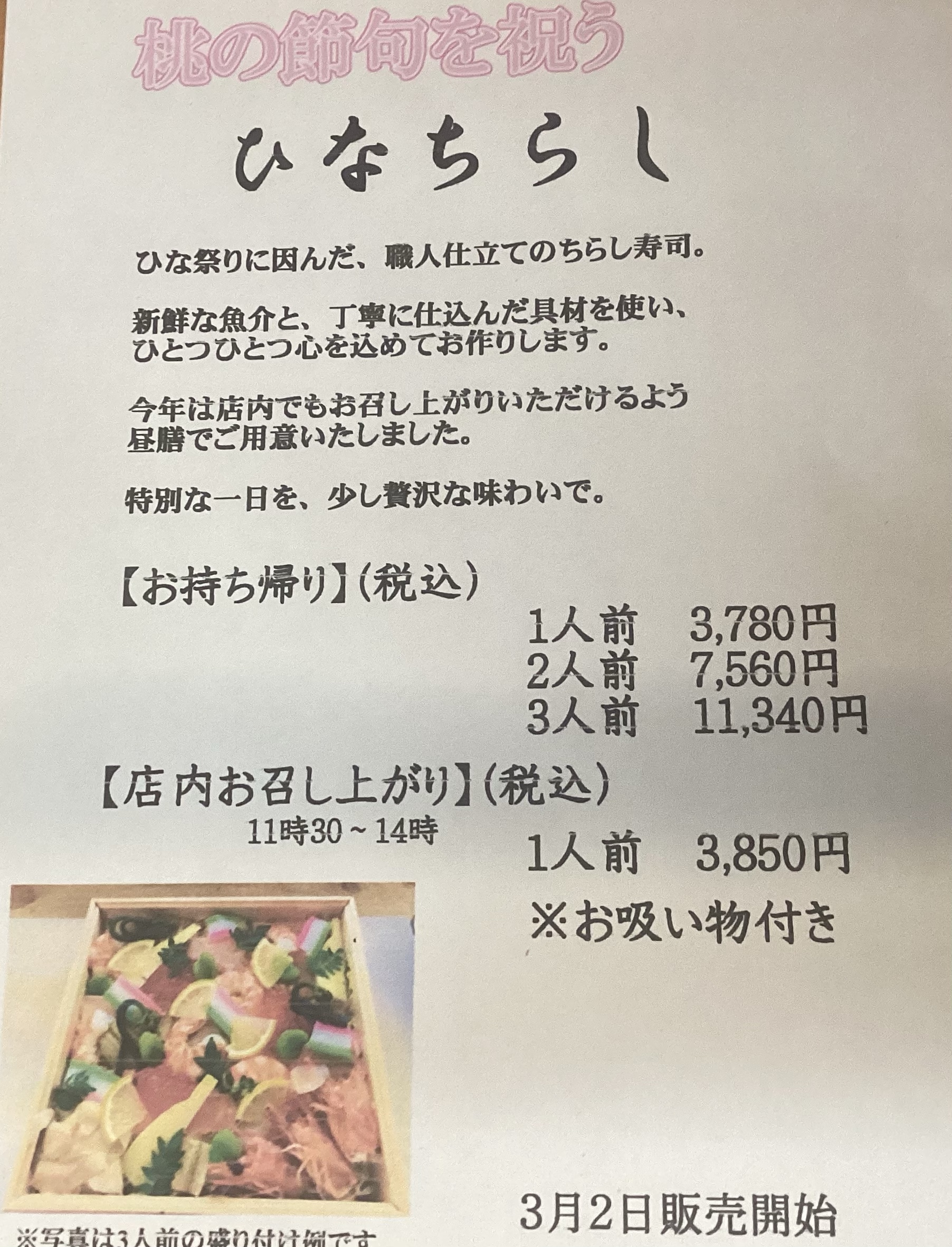 3月2日より「ひなちらし」を始めさせていただきます。3月末日までです。前日までのご予約となっていまず。どうぞよろしくお願いします。